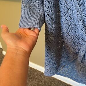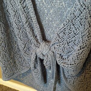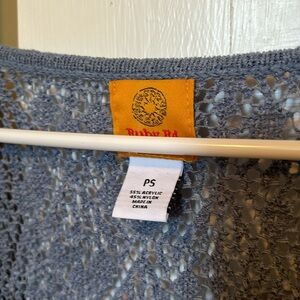 A great fall sweater from Ruby Rd. This sweater is a petite small in a gorgeous blue color with a tie at the stomach.