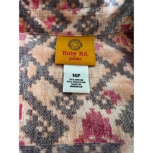 Add a bold touch to your wardrobe with this gently worn Ruby Road button-down shirt in a shiny peach tone featuring a striking Southwestern Aztec print. Made from a soft blend of 75% rayon and 25% polyester, it offers a lightweight, flowy fit and subtle sheen. This size 14 Petite (14P) shirt has long sleeves, a classic collar, and button front closure—perfect for dressing up jeans or layering with basics. Preowned in excellent condition.