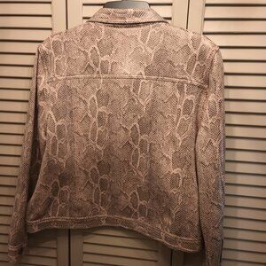 Leather look fabric, 95% polyester, 5% spandex. Button closure and front pockets. Button up cuffs.