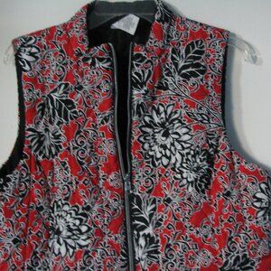 Outerwear vest in size large by Ruby Road. This pretty vest has a full zip front and two pockets. Super cute, colorful red and black leaf floral print. Made from 100% polyester, machine wash.