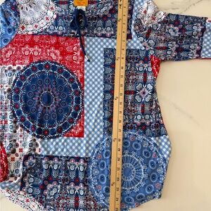 Ruby Road vibrant women's top features a stunning patchwork design in red, blue, and white. Perfect for adding a pop of color to your wardrobe. Excellent condition, petite, medium..