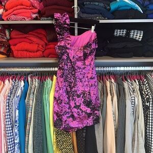 Ruby Rose fuchsia with black print overlay one shoulder mini dress size 5