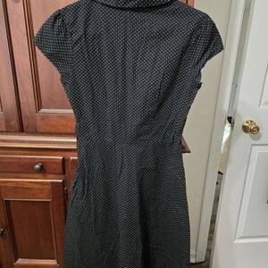 Stylish black dress with polka dots. Features bold red buttons and waistband. Ideal for versatile wear.