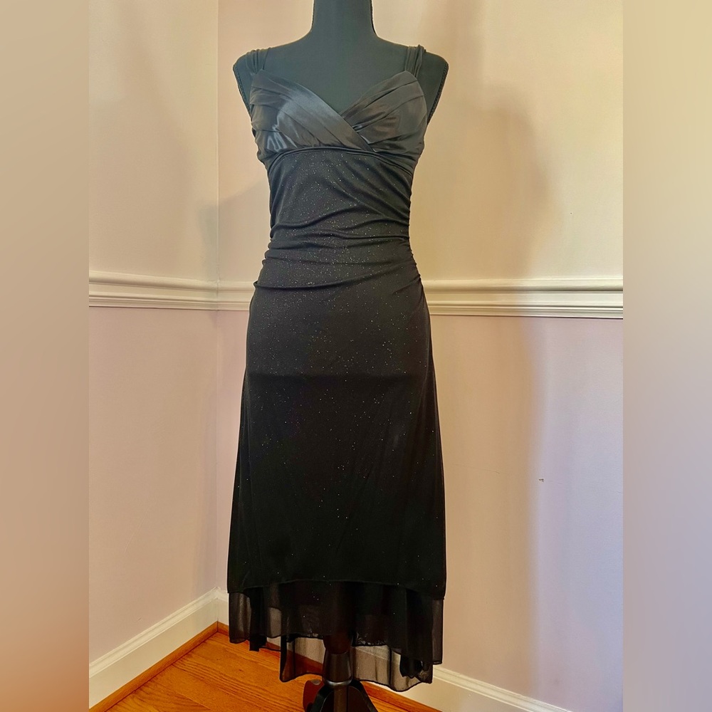 Turn heads in this stunning Ruby Rox black dress, featuring a ruched bodice for a flattering fit and a chic crossover bust detail for a stylish touch. The subtle sparkle throughout adds just the right amount of glamour, while the sheer layered hemline creates an elegant finish. Perfect for cocktail parties, date nights, or special occasions. In excellent condition with no holes, stains, or tears. Comes from a smoke-free home. Bundle to save!