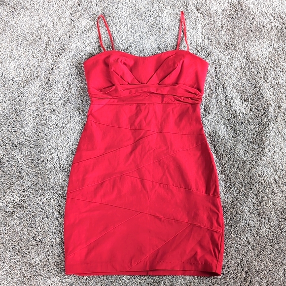 This dress is hott! It is a ruby red mini length dress with some good stretch and molded cups - no bra required unless you need or want some extra support. Zippered back. Great condition, just older - I've had it forever hoping to wear it again. Only worn a few times by me, but was a thrifted find ♥️