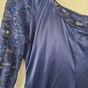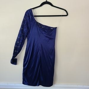 Navy Ruby Rox Bodycon Dress with One Shoulder Long Sleeve. Arm is lace and sequins. Front of Dress has the lace and sequins alternating down the front with smooth nay material. Dress has a lining and does stretch. Worn once. Size small.