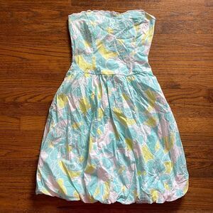 Vintage Ruby Rox size 7 Bright Blue, Pale Green/Yellow & White Abstract Floral Strapless Dress…good condition!