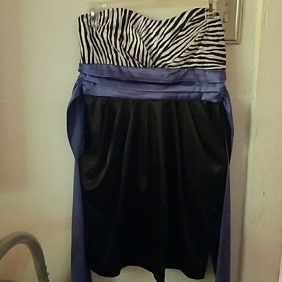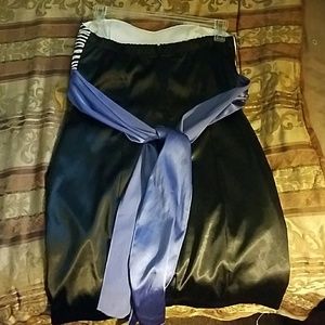 Slightly stretchy. Size 9. Used in good condition, No holes or stains. Back zipper closure. Also has hand pockets on on each side of the skirt. Purple waistband that ties. Satin like material but not for sure no tag.