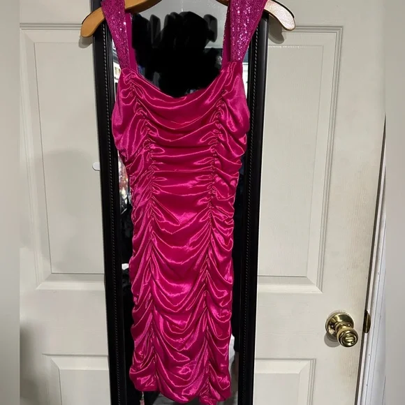 This amazing dress is a large but fits like a medium. Perfect for cocktails or as a prom or club dress