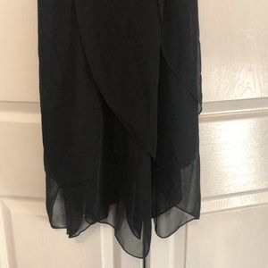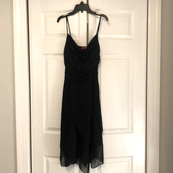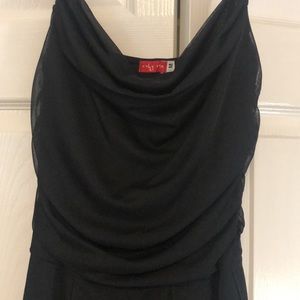 Size Medium juniors. Black cocktail dress. Tulle overlay, cowl neck, petal hem. No visible tears or stains.