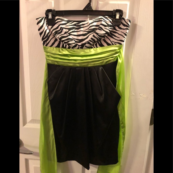 Zebra print top, lime green sash & black bottom.