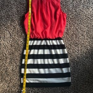 Like new condition dress by Ruby Rox. Coral top, fully lined, paired with a black and white striped fitted bottom. The bottom portion is a stretchy material but still holds shape, as shown. Great for the office and then happy hour, too! 👗