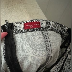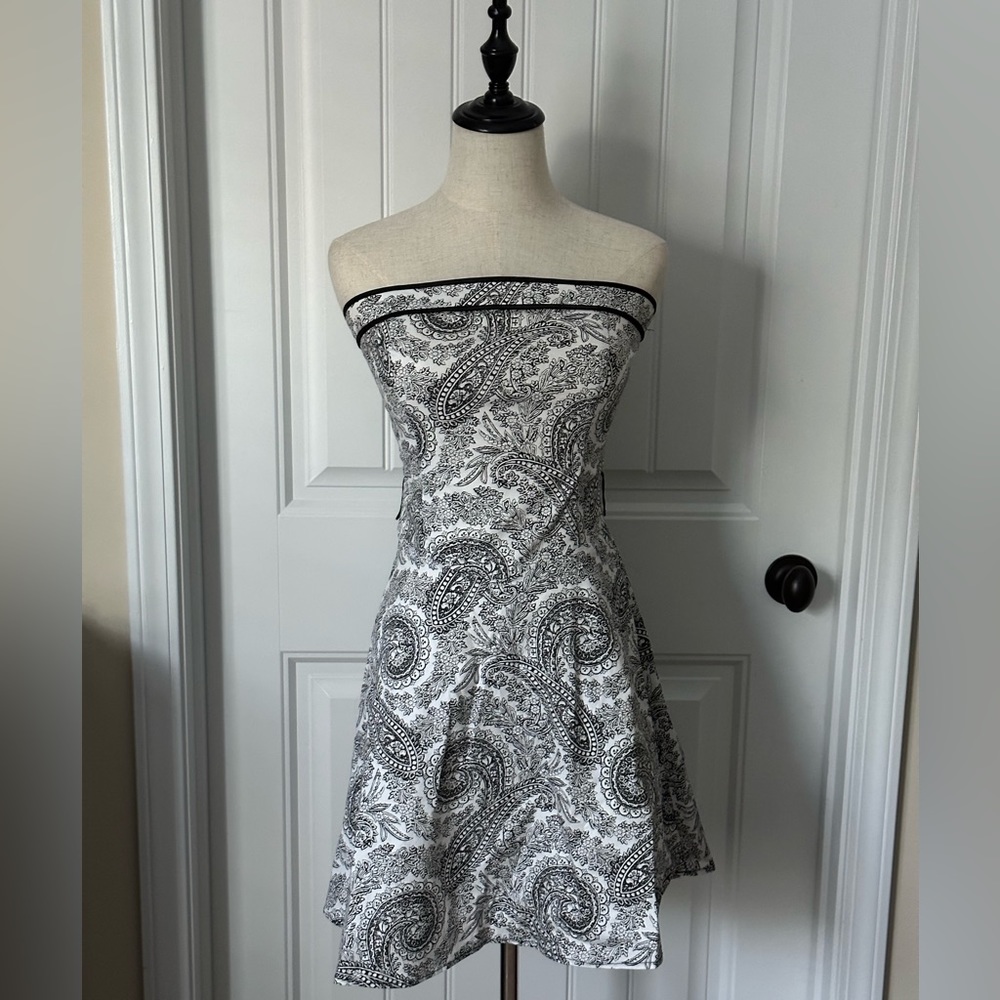 Ruby Rox Dress … Color: Black & White Paisley Print. Size: 3. Strapless. Has loops on both sides for a belt, but there is no belt included. Small stain at the very bottom (seen in photos).