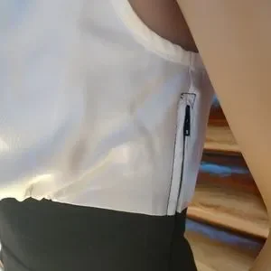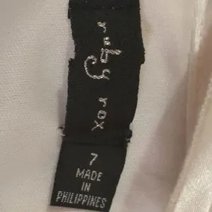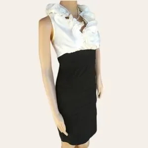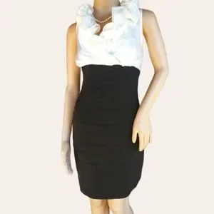 Black and white fancy Ruby Rox dress. The top area is made of a white satin feel material with ruffled collar and bottom portion is a stretchy pleated black skirt. It has a side zipper. Looks really pretty and dressy on. In great condition!