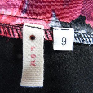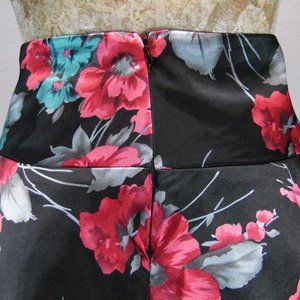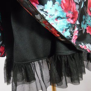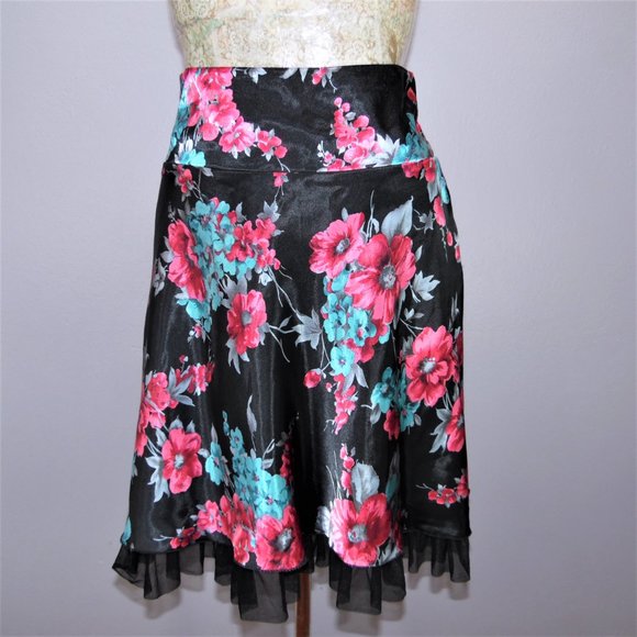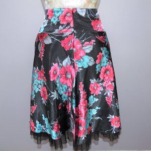 Size 9 Black Floral Print Skirt, Smooth Satin Fabric, Back zipper closure, Tulle Fabric sewn on liner peeks out at hem. Approximate measurements taken laying flat in inches: Waist 15", Length 23" plus 2" added with the Tulle