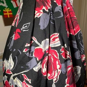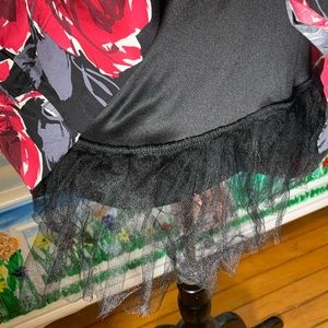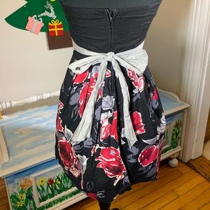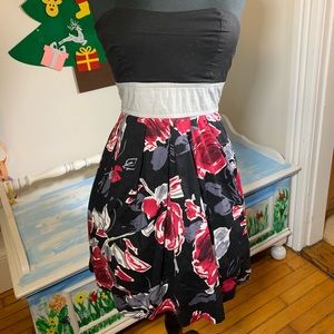 This Ruby Rox Strapless Dress is in great condition. Red, Black and Gray. Zips on the back and had a belt like tie that bows in the back. A little bit of tulle under the dress makes it puff out perfectly without it being too much. Theirs a plastic inside that helps the strapless dress stay up too. Smoke free home but pet friendly. A little bit of fuzz on dress but no damage. Approx 27” long, 14” wide.