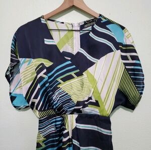 Great condition, silky feel dress from Ruby Rox. Dolman style top with thin elastic at waist for shape. V neck, rear zipper. Unlined but not sheer. Fun geometric print in white, navy, turquoise and lime green.