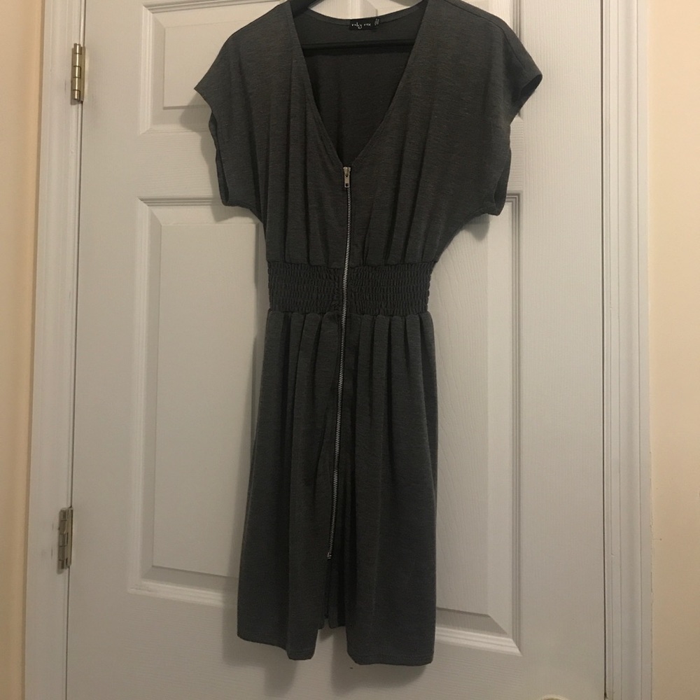 Good condition. Zipper from top to bottom. 35” length. Sleeveless. Has a elastic so it wraps nicely around the waist.