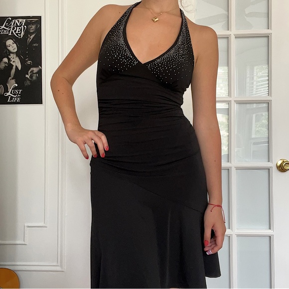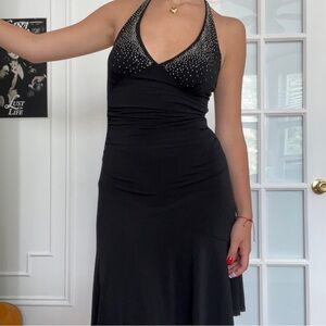 Y2k Black Haltar dress with rhinestone studded neckline
