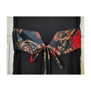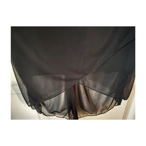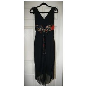 Maxi Dress with sheer over-skirt. Criss cross front. Above the ankle in front. Slightly longer in the back. Adjustable belt ties in back. Ties on shoulders.