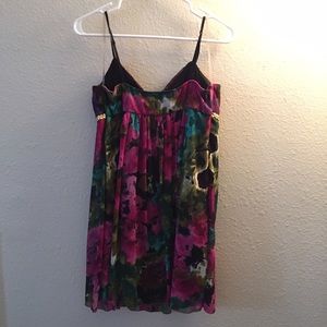 Worn twice! Ruby Rox patterned dress. Colors: fuchsia, green and black. It fits reslly nice. Fabric is soft and it had a detail of a golden braid. It says size 9 on the label but I am a Small/medium and it fits great.