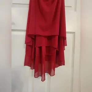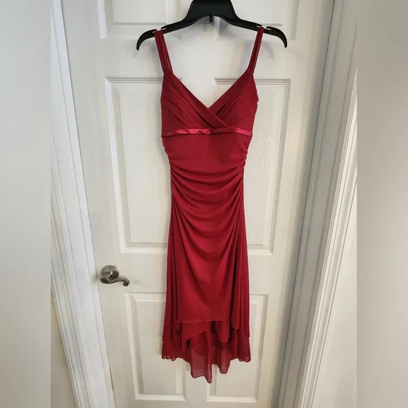 This striking red dress by Ruby Rox features a ruched design that elegantly drapes across the body, creating a sophisticated silhouette.
