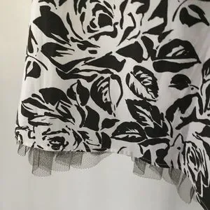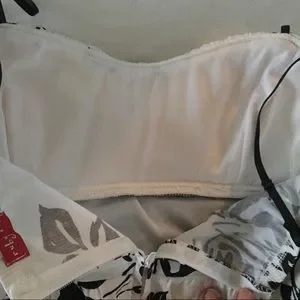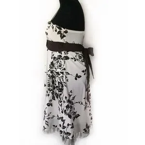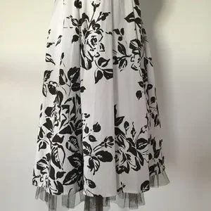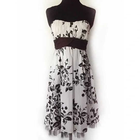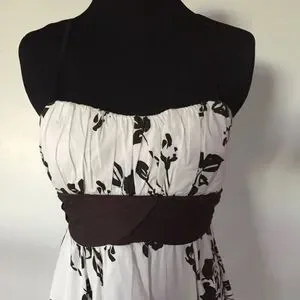 Pretty white dress with dark brown floral patterns and sash. There are adjustable spaghetti straps. It has a padded bra area and tulle hem for added volume. Fits like a woman’s size 4. Worn once for a bridal shower.
