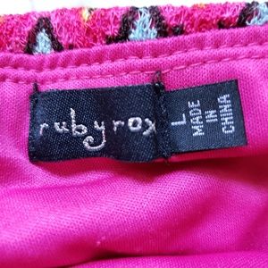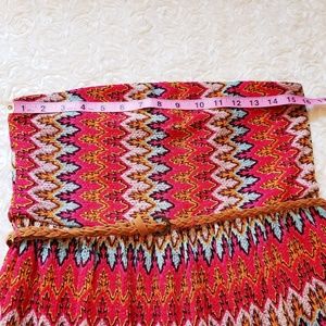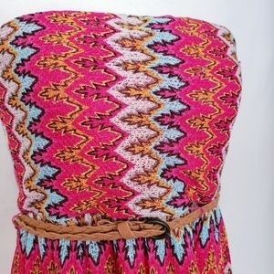 Ruby Rox strapless textured dress in pretty shades of pink, orange and blue with a skinny, suede-feel braided belt. Fully lined. Good condition. Size large. Approx measurements: 16" across chest, 25" armpit to hemline.