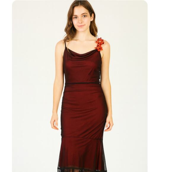 Ruched bodycon fit with longer, curled mesh accents at the hem for a dramatic finish