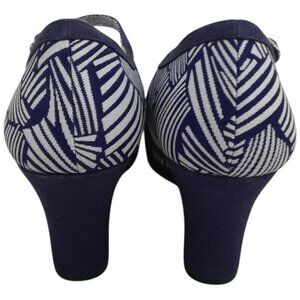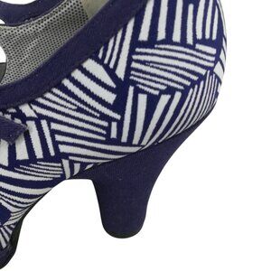 Design: Retro style Mary Jane heels in a geometric pattern with a red flower accent.