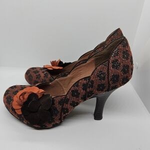Super fun orange pumps in a textured fabric with black and gold metallic flowers all over. Next to the toe is a large orange and a large brown flower accent. Scalloped sides. Heel looks like stacked wood. In good used condition with no known flaws. Heel is approximately 3.75"