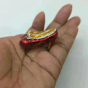 Step into a world of enchantment with this charming "Ruby Slipper Dreams" vintage shoe brooch. This delightful piece captures the magic of a fairytale, featuring a miniature slipper crafted with a rich, glossy red finish that catches the eye. The sparkling crystal accents around the edges add a touch of glamour and sophistication, while the gold-tone detailing evokes a sense of timeless elegance.