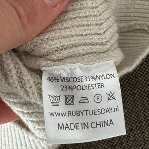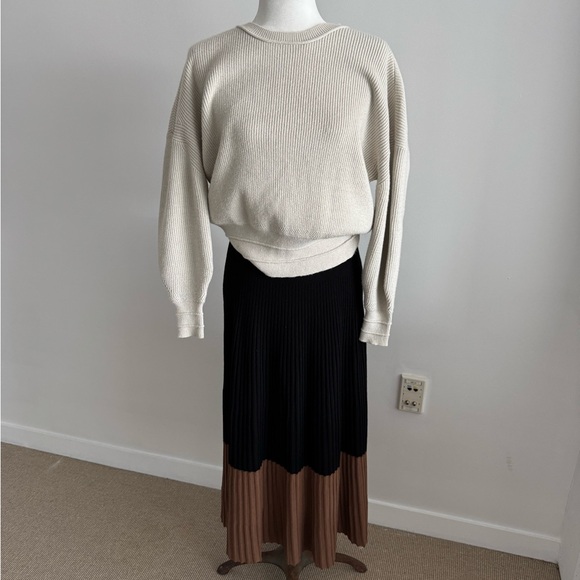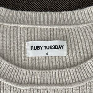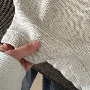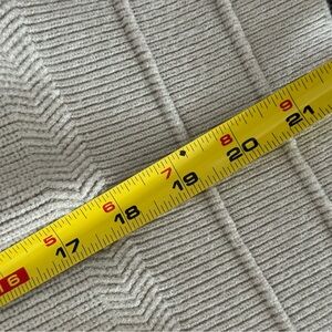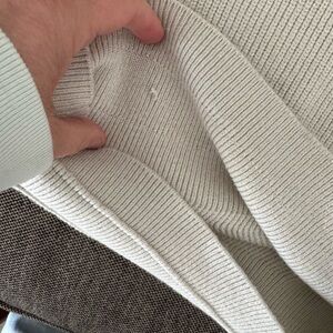Crewneck off white/stone sweater. Ribbing at hem and cuffs. The only mark is showing photo and it’s a small pull underneath. Arm has a good amount of room and it and is not fitted Measurements shown in photos. Very soft and not too heavy in weight. Size 0 is a small. Check measurements to confirm