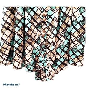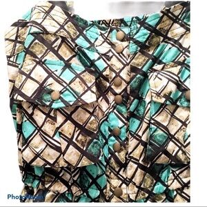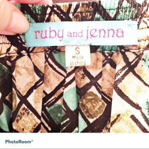 Ruby and Jenna mini dress in various shades of green and gray with a hi-lo hem. Size Small. Snap front closure, elastic waist for comfort. So adorable! Excellent condition โ no holes, stains or flaws.