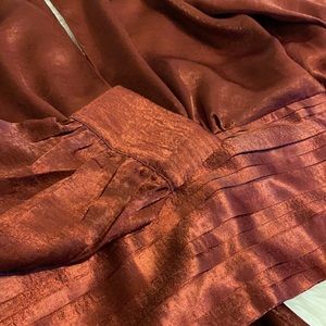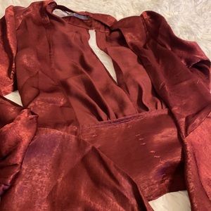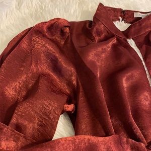 This beautiful blouse is sure to get compliments! Sexy and classy, this ruby red blouse has a satin feel, poofy sleeves that are cuffed at the edges, a cummerbund front, choker collar with snaps, and a deep slit opening in the front.