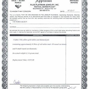 14K yellow gold with diamonds and rubies brooch. Rubies are .50ct with 30 round cut stones, 8 tiny diamonds accent the claws, 3.6 grams in weight, brooch measures 1' wide x .9" tall, 4 little legs & 2 claws, small pin close at back, excellent used condition, recently appraised for $855. The Crab is the zodiac sign for June/July birthdays and Ruby is the stone.
