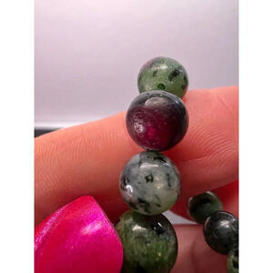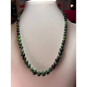 Ruby in zoisite beads in graduated sizes from about 2-9mm. Measures about 18 inches in length. Sterling silver lobster clasp clasp. 925