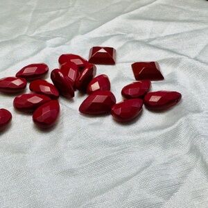 A lot of faceted pear & square ruby red gemstones for jewelry making. These 2 shapes are faceted square & pear, with pre-drilled holes at top of pears. 1/2 inches are approximate sizes.