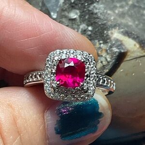 Size 7..genuine ruby. I love this ring! It is simple and elegant. You could easily stack it with others or wear alone. There is a pic with my presidium and under black light. This beauty is approximately 1ct and earth mined. Fantastic quality and condition. In solid, handcrafted, .925 silver.