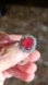 Gorgeous lab created Ruby with a sparking halo of diamond simulants. Beautifully designed in Rhodium over Sterling Silver and is a size 6. Weight is approximately 5 grams.