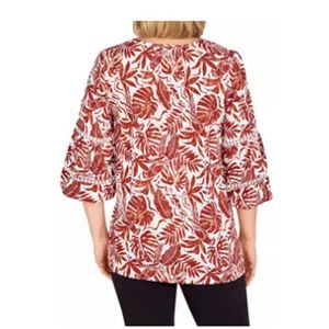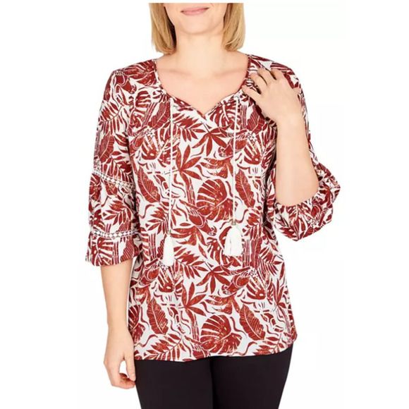 Ruby Rd Meet Me in Tahiti Linen Blend Printed Rust Tassel Blouse L