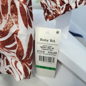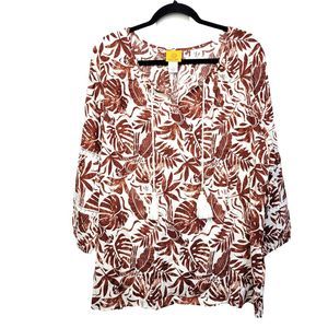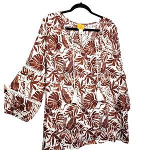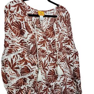 Ruby Rd Meet Me in Tahiti Linen Printed Rust Tassel Blouse L