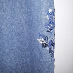 Classic color blue jeans. Straight leg with really nice flower embroidery on the side of the legs. Pre-owned in good condition.