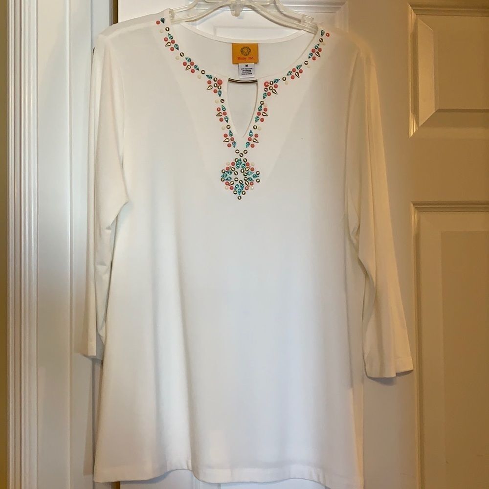 Ruby Rd. top with tons of bright & colorful bling. Pre-owned but like new condition. This brand normally runs large. This is a size medium but it fits me and I am now a large. I would call the color a very light cream