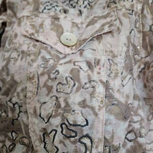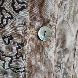 This is a sheer button up jacket by Ruby Rd. It is light pink with brown, gold, and tan abstract details. There are straps inside of each arm for roll tab cuffs. Note a small red mark in photo 6 on the chest.