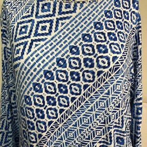 Ruby Rd. Size small blue geometric print top Tie side Studded neckline 3/4 length sleeves B2