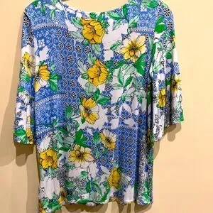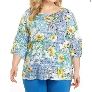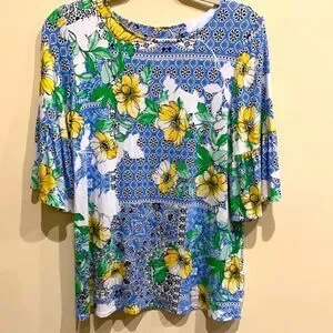 bold mix of floral and tile patterns add appeal to this flounce sleeve knit top from Ruby Rd.