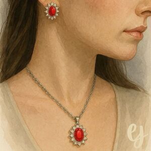 Ruby Red Oval Pendant Necklace & Stud Earring Set with CZ Halo in Silver Tone