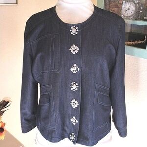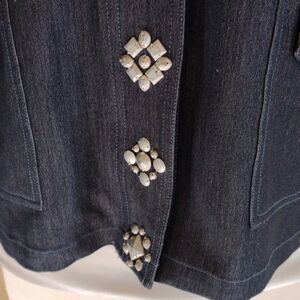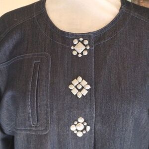 Lightweight denim with a little stretch. The front has embellished designs down the front that cover the large snaps that close the front. Two lower pockets and one slip pocket on the upper right. Stitching defines the shape. Size 14 measures 44 at chest, 42 at the bottom hem. 21 long from shoulder to hem. 19.5 long sleeves.