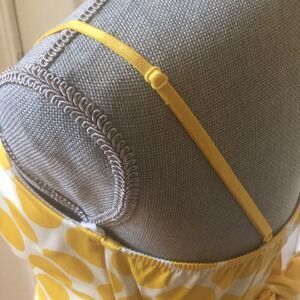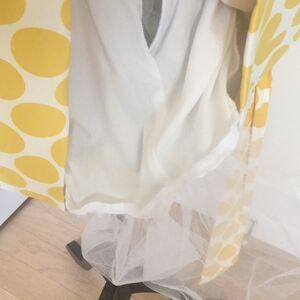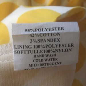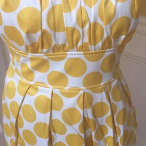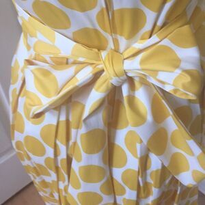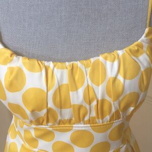 This dress is too cute. It is white with yellow polka dots. This dress has spaghetti straps, is lined, cinched at the top and ties at the waist. It is 16” across the waist and 27” in length. The dress zips in the back.